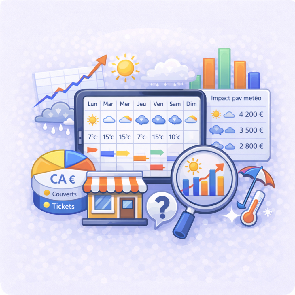Pour suivre l’impact de la météo sur votre CA, nous intégrons maintenant l’historique de comparaison ainsi que les prévisions (à J+7) de météo, des températures et de l’humidité