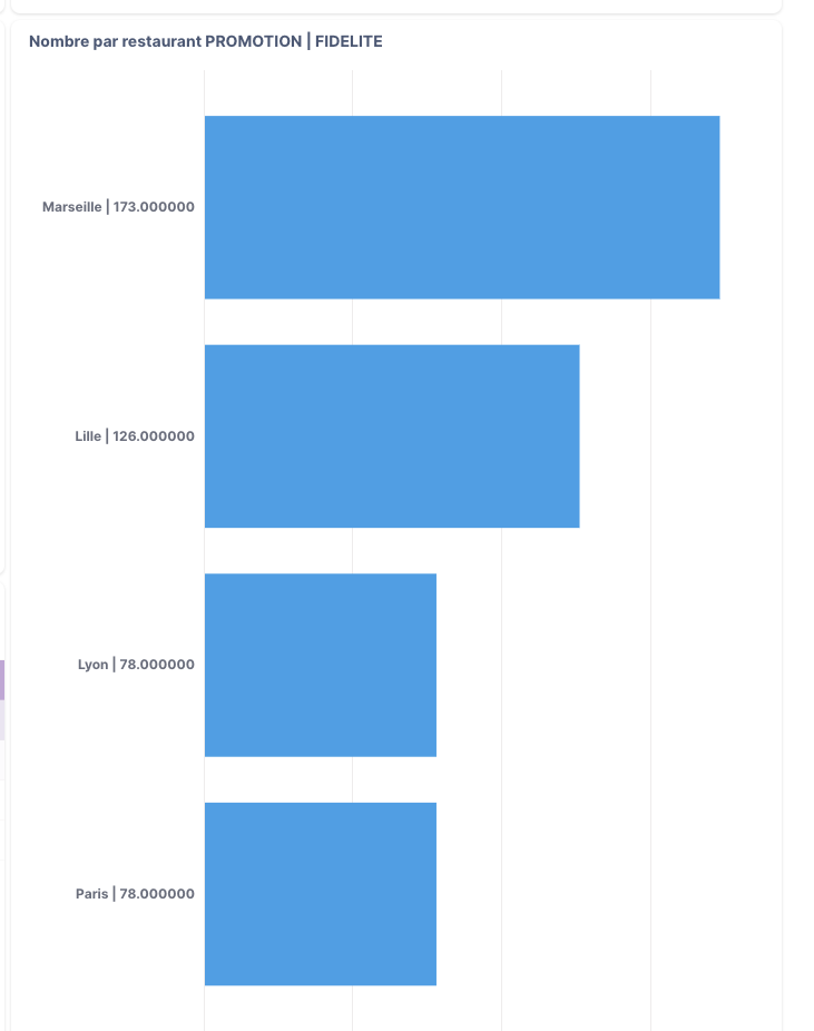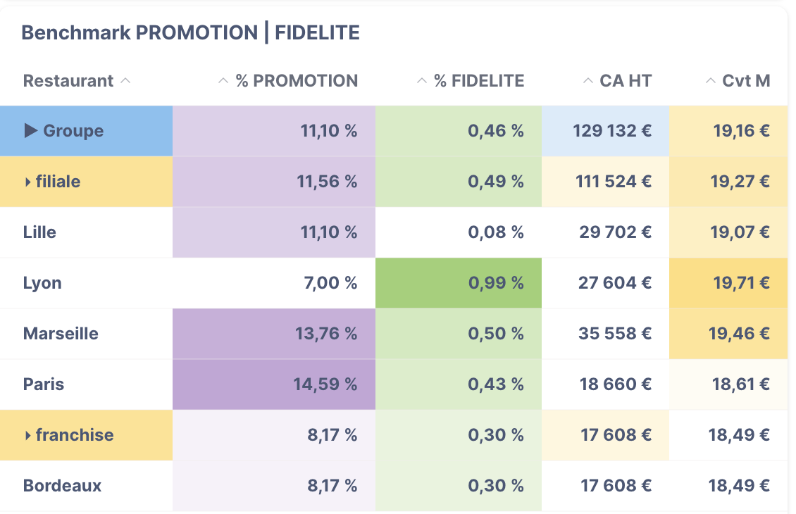 💡 Exemple métier : Le directeur réseau observe qu’un restaurant génère un taux de captage de 35 % pour une promotion sur le dessert, tandis qu’un autre n’atteint que 12 %. Il peut organiser des formations ou partager les bonnes pratiques entre restaurants.