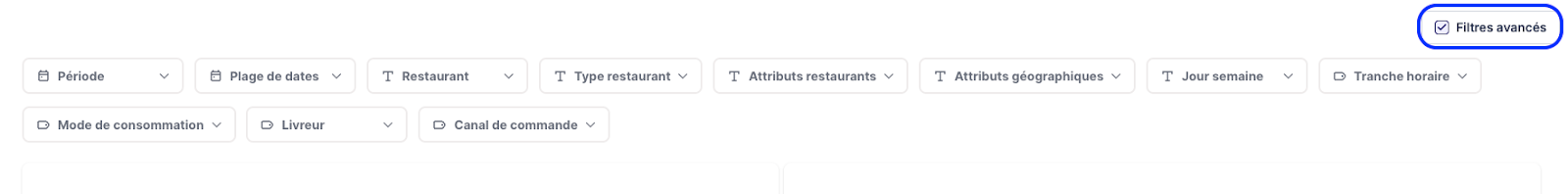 À savoirPour simplifier l’affichage, les filtres avancés sont masqués par défaut. Vous pouvez les afficher via le bouton Filtres avancés pour affiner vos analyses :