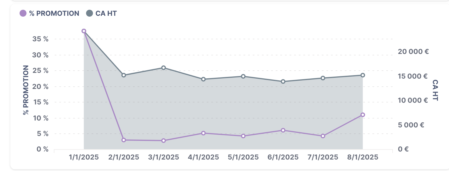 💡 Astuce : Combinez cette vue avec Évolution jour Promotions pour détecter les jours où la promotion fonctionne le mieux.