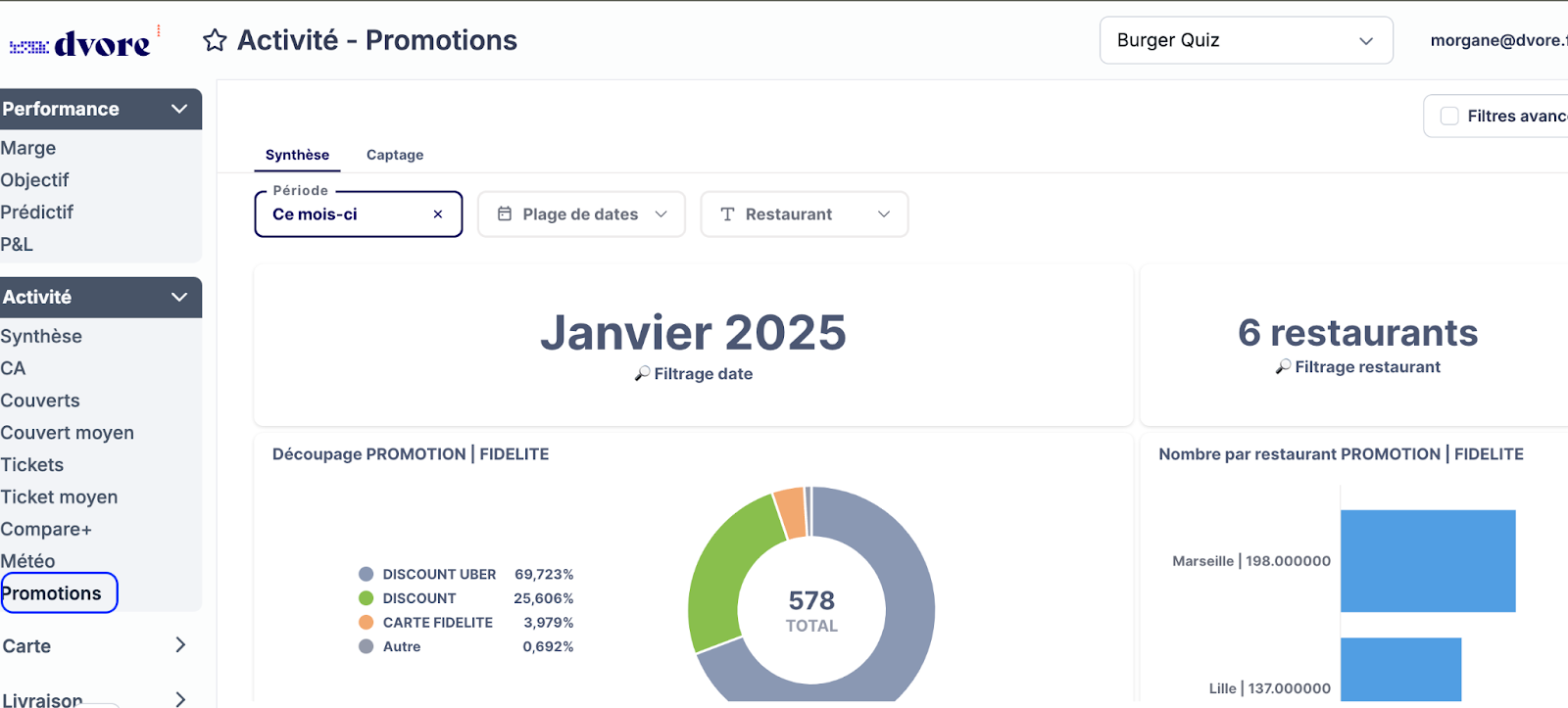 ✅ Réponse : Filtrez vos promotions par mode de consommation (sur place, livraison, Click & Collect) pour comprendre où elles performent le mieux.