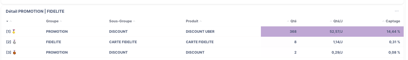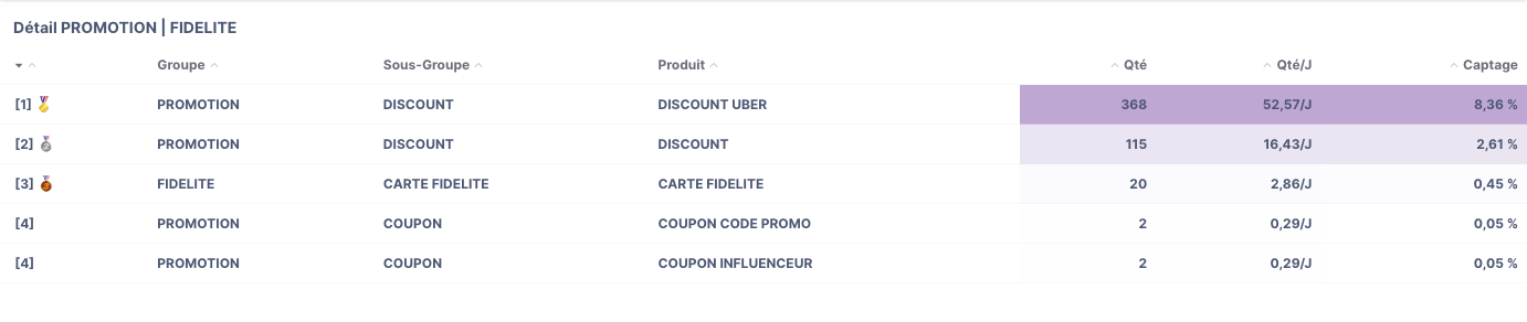 💡 Exemple métier : Une promotion “Remise 10 % Uber Eats” a un taux de captage élevé mais entraîne une baisse du CA sur les produits concernés. Le responsable marketing peut ajuster le montant de la remise ou limiter l’offre à certains produits pour optimiser la rentabilité.
